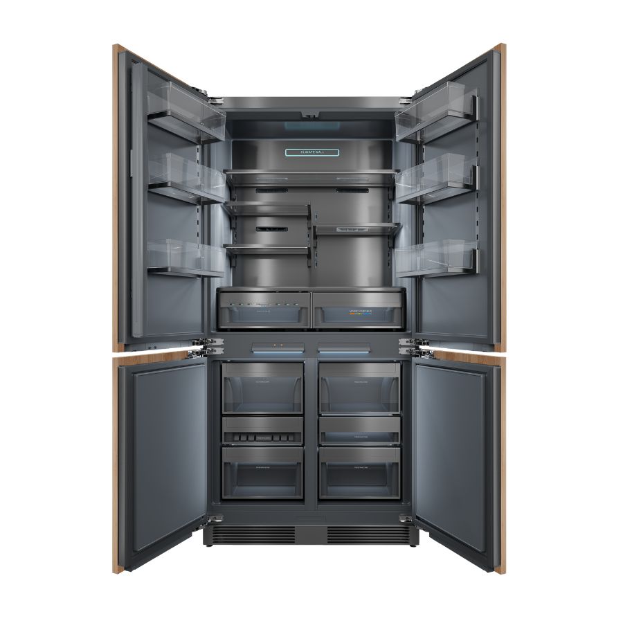 La cornice dei ripiani e dei balconcini in alluminio massiccio esprime un’estetica pulita, tecnica e raffinata, tipica dei frigoriferi di alta gamma. L’alluminio conferisce solidità strutturale e una sensazione di qualità immediatamente percepibile al tatto e alla vista. Il profilo metallico valorizza i materiali interni, creando contrasti eleganti con vetro e superfici trasparenti. Oltre all’estetica, l’alluminio garantisce durabilità, resistenza all’umidità e facilità di pulizia, mantenendo nel tempo un aspetto impeccabile. Il risultato è un interno ordinato, luminoso e professionale, pensato per chi ricerca funzionalità evoluta e design senza compromessi.