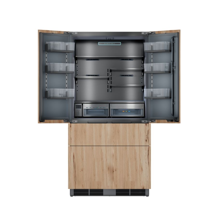 La cornice dei ripiani e dei balconcini in alluminio massiccio esprime un’estetica pulita, tecnica e raffinata, tipica dei frigoriferi di alta gamma. L’alluminio conferisce solidità strutturale e una sensazione di qualità immediatamente percepibile al tatto e alla vista. Il profilo metallico valorizza i materiali interni, creando contrasti eleganti con vetro e superfici trasparenti. Oltre all’estetica, l’alluminio garantisce durabilità, resistenza all’umidità e facilità di pulizia, mantenendo nel tempo un aspetto impeccabile. Il risultato è un interno ordinato, luminoso e professionale, pensato per chi ricerca funzionalità evoluta e design senza compromessi.