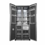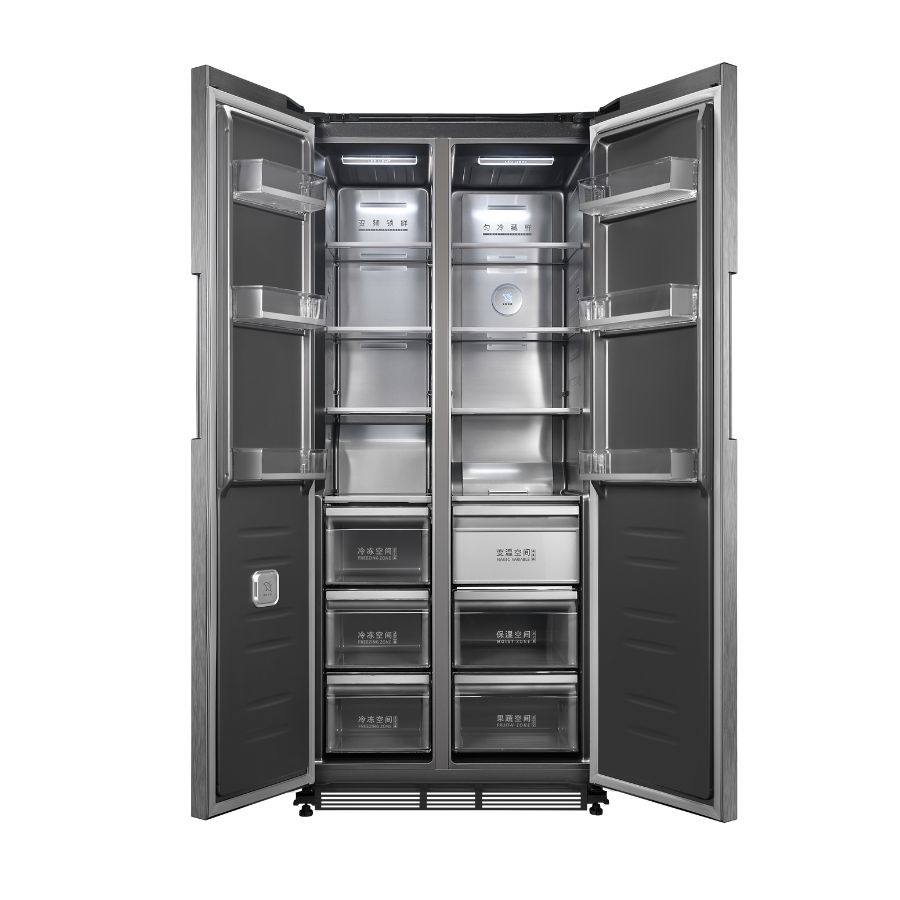 Questo sistema evita qualsiasi interferenza con i mobili laterali, prevenendo urti e danneggiamenti quando il frigorifero è incassato. Consente un’integrazione perfetta anche in nicchie a muro o con il fianco a diretto contatto con la parete poiché la porta può aprirsi comodamente a 90° senza limitazioni. In questo modo è garantita la totale estraibilità dei cassetti interni, unendo funzionalità e massima libertà progettuale.